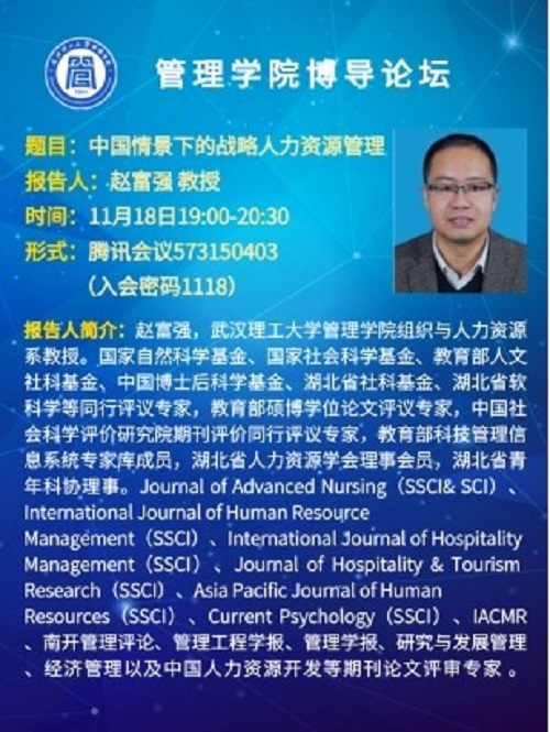报告人简介:赵富强,360环球在线注册组织与人力资源系教授。国家自然科学基金、国家社会科学基金、教育部人文社科基金、中国博士后科学基金、湖北省社科基金、湖北省软科学等同行评议专家,教育部硕博学位论文评议专家,中国社会科学评价研究院期刊评价同行评议专家,教育部科技管理信息系统专家库成员,湖北省人力资源学会理事会员,湖北省青年科协理事。Journal of Advanced Nursing(SSCI& SCI)、International Journal of Human Resource Management(SSCI)、International Journal of Hospitality Management(SSCI)、Journal of Hospitality & Tourism Research(SSCI)、Asia Pacific Journal of Human Resources(SSCI)、Current Psychology(SSCI)、IACMR、南开管理评论、管理工程学报、管理学报、研究与发展管理、经济管理以及中国人力资源开发等期刊论文评审专家。